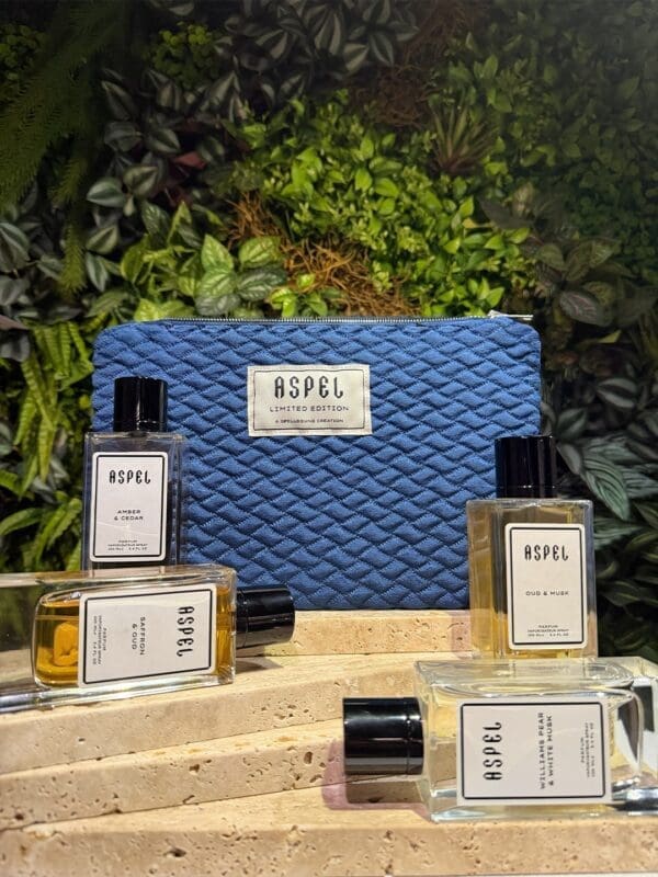 Discover the Aspel bundle: a curated fragrance selection paired with a limited edition pouch, exclusively crafted for a select few—only 214 pieces made.